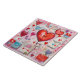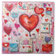 Ceramic tile with a whimsical pattern. Scrapbook style doodles and scribbles. Red and pink hearts and various letters and envelopes scattered all around.