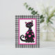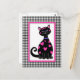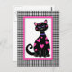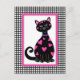 This whimsical kitty is covered in pink hearts and has a pink frame with a black gingham border.