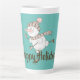 Whimsical holiday mug features ice skating snowman with brown and pink scarf and beanie on aqua background and customisable text.