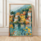 Bring vibrant European charm to your home with this whimsical art print featuring a colourful lakeside village nestled among cypress trees and wildflowers. With warm yellow and terracotta buildings reflected in tranquil blue waters, this scene evokes the romance of the Italian coast or a peaceful Mediterranean getaway. Perfect for travel lovers, cottagecore fans, or anyone craving a cheerful burst of floral colour and scenic serenity on their walls.