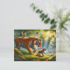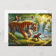 A vibrant and enchanting jungle scene where a mother tiger and her playful cub traverse a lush, sunlit clearing. Colourful birds, including parrots and various songbirds, flutter around, adding splashes of colour against the verdant backdrop. A serene waterfall cascades gently in the background, creating a mist that catches the golden light filtering through the dense canopy above. Nearby, a group of deer stand alert, observing the tigers' journey through the forest. Wildflowers and ferns blanket the ground, and sunlight streams through the trees, illuminating the scene with a warm and magical glow.