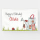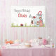 Cute, girly and personalised happy 1st Birthday banner featuring an adorable girl ladybug sitting on swing, which is hanging from an adorable garden watering can house, two additional ladybugs join in this whimsical and magical garden party scene. Personalise this beautiful birthday party banner with girl’s name and customise greeting as needed.