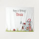 Cute, girly and personalised happy 1st Birthday backdrop tapestry; featuring an adorable girl ladybug sitting on swing, which is hanging from an adorable garden watering can house, two additional ladybugs join in this whimsical and magical garden party scene. Personalise this beautiful birthday party backdrop with girl’s name and customise greeting as needed.