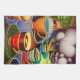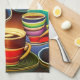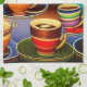 Whimsical surreal AI generated digital art dreamscape kitchen towel features colourful cups filled with coffee.