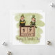 Whimsical design features two leprechauns perched on calendar cube for March 17th, with moss green watercolor wash background and customisable "Happy St. Patrick's Day" text in handwritten style brown font.