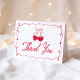 Express your appreciation with this sweetheart-themed baby shower thank you card from our Whimsical Little Sweetheart Valentines Baby Shower collection. The front of the card features two red heart-shaped cherries tied with a bow above “Thank You” written in a handwritten red script. A hand-drawn red ribbon frame accented with small heart details surrounds the design, creating a charming Valentine-inspired look. The inside of the card provides space for customers to add a personalized thank you message. The back is finished with coordinating red and white stripes for a polished, cohesive touch.