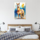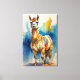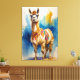 This delightful watercolor painting features a smiling llama adorned with a vibrant, patterned blanket. The background is an abstract splash of blue and yellow hues, contrasting beautifully with the warm tones of the llama’s fur. The blend of realistic animal portrayal and whimsical artistic style creates an eye-catching piece that combines natural elements with artistic expression, perfect for adding a touch of joy and colour to any space.