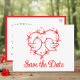 A sweet and cheerful "Save the Date" postcard designed for couples who love nature, warm moments, and a playful touch of personality. The whimsical lovebirds illustration and heart add a cute and unique feel that complements boho weddings, outdoor summer celebrations, and relaxed spring gatherings. The red and white color palette keeps everything bright, joyful, and full of charm. Personalize your postcard with your names, date, and location to share your happy news in a heartfelt, memorable way that reflects your unique style.