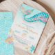 Immerse yourself in the mesmerising watercolor artwork that showcases the graceful tail of a mermaid, adorned with shimmering gold sequins that add a touch of opulence. The harmonious blend of tranquil turquoise and delicate pink hues creates a whimsical ambiance, setting the stage for a celebration that is both enchanting and unforgettable.