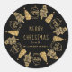Gold wreath made up of Christmas trees and gingerbread houses surround Merry Christmas which is written in a very modern handwritten font. Your name follows below. The black background really makes the gold wreath design pop. One of the Christmas trees is solid gold. The second has flowing cold branches. The gingerbread house is a detailed outline that shows a lot of black. The result is a modern and open design.
