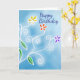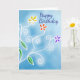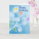 A happy birthday card with a modern and whimsical floral design. A yellow flower, red flower and purple flower are at the end of a white scroll stem. Long green leaves are at the base. A deep blue background with soft white highlights makes the flowers stand out. Happy birthday is written in navy blue. All of the text on the card can be customised and personalised to make this a very special birthday card.