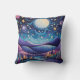 A pillow with a beautiful illustration. Whimsical and fanciful vibe. A big glowing moon with stars all around. Hanging over a lovely landscape of trees, mountains and a winding river. Awesome magical mystical vibe.