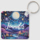 Personalised keychain with a beautiful illustration. Whimsical and fanciful vibe. A big glowing moon with stars all around. Hanging over a lovely landscape of trees, mountains and a winding river. Awesome magical mystical vibe.