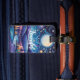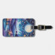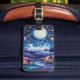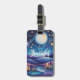 A luggage tag with a beautiful illustration. Whimsical and fanciful vibe. A big glowing moon with stars all around. Hanging over a lovely landscape of trees, mountains and a winding river. Awesome magical mystical vibe.