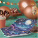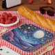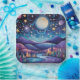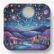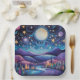 Paper plates with a beautiful illustration. Whimsical and fanciful vibe. A big glowing moon with stars all around. Hanging over a lovely landscape of trees, mountains and a winding river. Awesome magical mystical vibe.