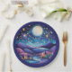 Paper plates with a beautiful illustration. Whimsical and fanciful vibe. A big glowing moon with stars all around. Hanging over a lovely landscape of trees, mountains and a winding river. Awesome magical mystical vibe.