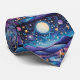 Patterned tie with a beautiful illustration. Whimsical and fanciful vibe. A big glowing moon with stars all around. Hanging over a lovely landscape of trees, mountains and a winding river. Awesome magical mystical vibe.