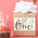This whimsical and sweet design features a simple white daisy, bold typography in the word 'ONE' with pink balloon hearts and a custom photo of the birthday girl.