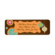 Holiday return address labels with a deep brown background, several pretty whimsical ornaments, and an orange frame where you can add your name and address before ordering.