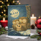 This charming Christmas card features a heartwarming scene of a cozy owl family nestled under a winter sky. The parents are peacefully asleep, while their wide-eyed little one eagerly watches Santa’s sleigh glide across the glowing full moon. Hand-drawn with a whimsical, storybook feel, the illustration uses soft browns and deep midnight blues to evoke a sense of calm, magic, and wonder. Send holiday cheer to friends and family with a custom card that brings warmth and joy to the season.