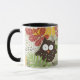 A playful illustration of a cute brown owl surrounded by colourful abstract flowers and leaves in a vibrant forest scene.