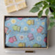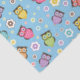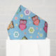A playful and colourful seamless pattern featuring cartoon owls in various bright colours such as pink, orange, green, brown, and blue. The owls are surrounded by a mix of small, multicolored flowers on a soft blue background, creating a cheerful and whimsical design. Perfect for children's products.
