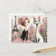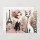 Vibrant Illustration: The postcard showcases a beautifully detailed image of a Parisian woman dressed in chic attire, complete with a fashionable hat adorned with flowers. Beside her is an elegant tall white cat with striking green eyes, set against a backdrop of the iconic Eiffel Tower and blooming flowers.