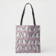 This cute tote bag features a hand drawn black and white penguin pattern on a medium dusty fuchsia background. The penguin images are contrasted with light orange on the feet, head, and chest. They are shown in several positions, with a few scattered snowflakes falling among them. Definitely unique! Both sides of the bag have the same design.
