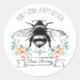 A whimsical elegant personalised product label featuring a hand sketched vintage bee with watercolor floral and banner in the round, and unique hand lettered style typeface.