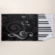 A whimsical musical design with curved piano keyboard keys and musical notes on a subtle flourish pattern in grey on a black background. Ideal for the pianist, piano student or the piano lover.