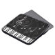 A whimsical musical design with curved piano keyboard keys and musical notes on a subtle flourish pattern in grey on a black background. Ideal for the pianist, piano student or the piano lover.