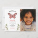 Cute butterfly theme birthday party invitation featuring an illustration of a pink butterfly with green and faux gold foliage at the bottom. Perfect for a girl's whimsical birthday party! Add your child's picture on this card.