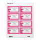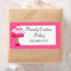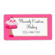 Pretty bakery box label done in a pink background, with a white text area, with a green scalloped edge. Cute graphics of a whimsical cake stand filled with pretty cupcakes. The black text is ready to personalise for your business needs.