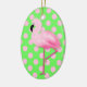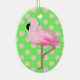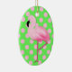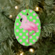 Colorful Christmas tree / decorator ceramic ornament, with graphics of a a fluffy looking pink flamingo, against a whimsical bright green with pink polka dot background. Add any text you want by customizing this ornament. Fun gift idea for any flamingo lover.