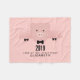 Personalised blanket celebrating the Chinese New Year. A big pink pig face wearing a formal bow tie. Lifted up by his black cloven hooves and peering over a table. Cute and whimsical drawing. Set on a pink background with faded hearts. Ready to celebrate the year of the pig 2019.