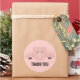 A thank you sticker with a drawing of a cute pink pig's face. Lifted up by his black cloven hooves and peering over a table. Cute and whimsical drawing. Set on a pink background with some faded hearts here and there.