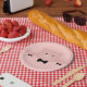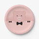 Paper plate with a drawing of a cute pink pig's face. Lifted up by his black cloven hooves and peering over a table. Cute and whimsical drawing. Set on a pink background with faded hearts.