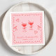 Trendy retro-inspired pink and red bachelorette party napkins featuring a wavy frame adorned with coquette bows, whimsical hand drawn illustrations of hearts and margarita cocktail glasses, and "Bachelorette Party" and the name of the bride showcased in a fun, playful script.