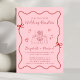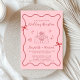 Trendy retro-inspired pink and red wedding reception invitation featuring a wavy frame adorned with coquette bows and whimsical hand drawn illustrations of hearts, stars and an elegant romantic wedding table. "Wedding Reception" and the names of the bride and groom are showcased in a playful red script.