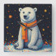 A charming polar bear sits on snowy ground, wearing a bright orange scarf, beneath a dark star-filled sky. Whimsical and cozy, perfect for children's books or festive gift themes.