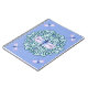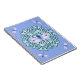 Gorgeous purple mandala dragonfly notebook. Features an ice blue mandala with four purple and blue watercolor dragonflies on the outsides of the mandala and one large dragonfly right on top of the centre of the mandala. Blue/purple background.