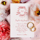 These stylish red and white wedding invitations feature a red, hand-drawn illustration of a wedding crest with cherubs and flowers, and your initials or monogram in the centre. The text is a trendy handwritten script for a whimsical and romantic look.