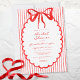 This whimsical bridal shower invitation features a bright juicy red watercolor bow and a playful scalloped oval frame against a classic red and white striped background. Perfect for a shower with a preppy or coastal aesthetic, this charming design provides a sweet, hand-painted look for your special celebration. Created by Simply Farmhouse Press.