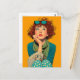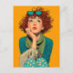 A vibrant illustration of a dreamy redheaded girl with bright blue eyes, wearing teal and polka dot attire, holding a newspaper. Set against a bold orange background, her curious gaze and playful style evoke a retro-modern charm. Perfect for prints, accessories, and quirky designs.