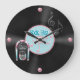 Fun retro 50's style clock made to look like a vinyl LP record, with graphic text reading Sock Hop, on the label. Pink button like dots represent the 12, 3, 6, and 9 on the clock and graphics of musical notes and a pink and blue jute box decorate the clock. Great clock for any room of the house and makes a great gift idea.