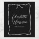 A simple handwritten script modern minimalist white typography wedding wine labels on black, framed with a wavy ribbon frame with bow in a hand drawn style. Informal whimsical coquette style.