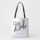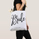 This stylish tote bag features modern black handwritten script and says "bride", with a spot to add your name.