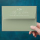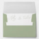 Elegant script calligraphy sage green wedding envelope. Present your wedding invitations in style with these sage green envelopes featuring whimsical script calligraphy. The envelopes showcase a sophisticated sage green colour, setting a tone of understated elegance. The envelope flap provides an excellent opportunity for personalisation, allowing you to feature your initials and names in graceful script typography, beautifully complemented by your return address in a crisp, white print. The inside of the envelope also features the names of the couple. These are not merely envelopes; they are the first glimpse your guests will have into the beauty and refinement of your wedding day.