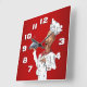 A whimsical singing chef carrying his latest culinary creation. The rich red background with subtle shading contrasts well with the white clock face numbers. This clock is a great choice for kitchens, restaurants, cafes and bistros. It makes a nice gift for your favourite chef or foodie.