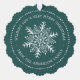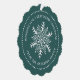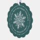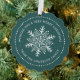 Christmas ornament card featuring a white, whimsical, folk art style snowflake inside a dot border and your custom photo. Customisable text "Wishing you a very merry Christmas". White text on a pine green background.